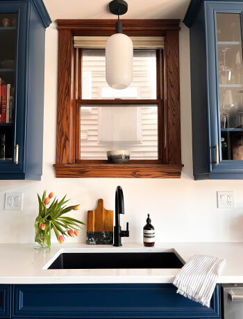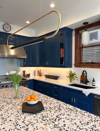 An upgraded kitchen featuring pops of colors, durable materials and refined statement fixtures and luminosity