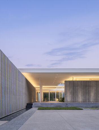 The Preston Hollow House blurs the lines between indoors and out. A floating pavilion roof hovers over the interior and exterior spaces while sliding glass panels and corrugated concrete walls define its courtyards. The house is open and light-filled yet provides seclusion from the street.