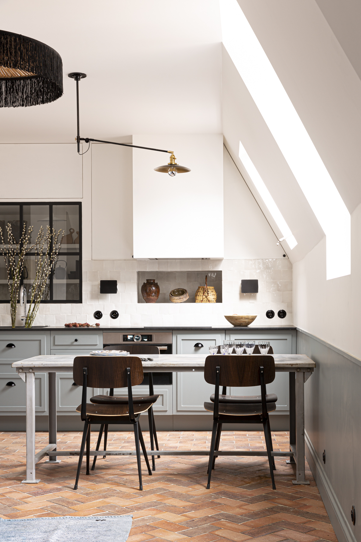 The countertop is Zimbabwean granite, a favorite of Marianne’s, and the zellige used as a backsplash are from Mosaic Factory. The One-Arm Chandelier is a Wo & Wé design. Marianne cleverly distinguished the living area from the kitchen by applying the terra-cotta flooring in two patterns.Photograph by Grégory Timsit.