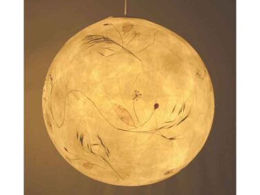 Noticed lately: simple Noguchi-esque lamps made fancy with tassels or with hand-painted watercolor motifs. Here’s a roundup: