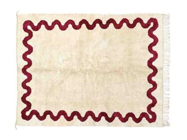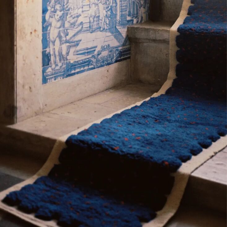 Above: Olivier Garcé and Clio Dimofski of Garcé Dimofski. Above: The Echo Rug, in blue and cream, is inspired by the way that “memory cracks apart as time carries on.” Like many of the rugs in the collection, its combination of knotted and flatwoven wool “calls for the hands of our master weavers,” according to Beni Rugs. Like each of the designs, it starts at $915 for an area rug and is also available from Invisible Collection. Above: The sumptuous Cobalt Rug nods to “the hue’s historical significance in traditional Portuguese azulejos.” Above: The Echo Rug in situ. Above: The Luz Rug, “an abbreviation of Nossa Senhora Da luz or ‘Our Lady of Light,’ is a subtle symphony of perspective inspired by the dance of sunlight and shadow on Lisbon’s azulejos.” Above: A personal favorite, the Ondine Rug evokes “the salty melody whispered inside a seashell…the curving linework of Henri Matisse, and the little wave-like borders that often decorate coastal azulejos in Portugal.” It’s also a good way to add a dose of red to any room. Above: Others we love? The vibrant Fado Rug (shown), Solaris Rug, and Horizonte Rug; to see the full collection, head here.