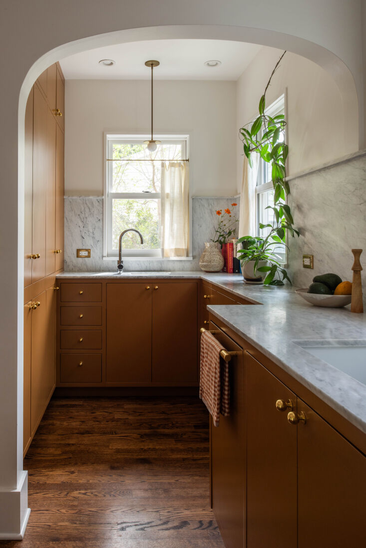 Above: At Beata Heuman’s own home, the stair rail and wall is painted in Cigar, a shade from Heuman’s own collaboration with Mylands. “Cigar is inspired by Shaker pieces from the 1800s and the color of a good cigar. It is a surprisingly effective and a modern-looking, graphic alternative to natural wood.” Photograph by Beth Davis for Beata Heuman LTD, courtesy of Beata Heuman. Above: Architects Chelsie Lee and Emily Knudsen of Portland, Oregon-based Attend Interior chose Benjamin Moore Fort Sumner Tan 1119 for the kitchen cabinets of a remodel in Westmoreland. The color, Chelsie explains, “is a rich, caramel-y, saddle leather color that doesn’t go too brown or too orange. It pairs well with the peachy-pink dining room and feels both bold and somewhat neutral.” Photograph by Malcom Lee for Attend Interior. Above: Architects Mathias Mentze and Alexander Ottenstein of Copenhagen-based firm Mentze Ottenstein implemented a deep ochre paint color, Oxydbrun Ground Color Paste from Linolie & Pigment, in the bedroom and hallway of the Dinesen House in Denmark. Above: Architect Anais Blehaut of Daab Design in London applied Farrow & Ball London Clay No.244 to the upper wall and ceiling of a Paris kitchen. Says Anais: “Farrow & Ball London Clay is a perfect balance between depth (provided by absorption of light by the dark tone) and reflectivity (provided by the light tone). It changes radically with the surrounding luminosity and provides different ambiances. London Clay is also very warm and comforting but equally works with metal and cold colors, which is great for a kitchen/dining room.” Above: In a 1640s Georgian house in East Sussex, Cassandra Ellis implemented a shade from her own line, Atelier Ellis, called Paper & String, “a deeply pleasurable brown.” Photograph from In the Stillness: A 1640s Georgian in an Affecting Palette by Cassandra Ellis.