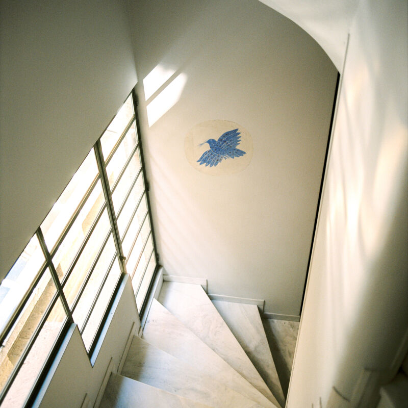 Above: A water feature in the"'secret garden" leads to the door to the communal garden, which is shared by other neighborhood houses and where the children play ball games.