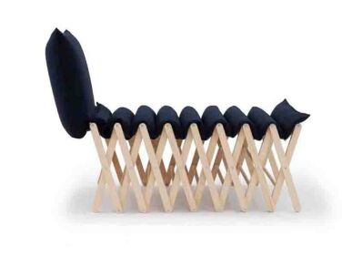Above: The design folds up for easy storage and can also be used as a chair. “Ingenious, versatile, like a millipede, this lounge is both practical and comfortable, unfolding to adapt to the space and the mood,” wrote the IDEAT jury. It’s available in Europe from Campeggi; US buyers can find it at Mohd as the Brando Folding Sunbed; $1,416 and from Gessato. The frame is ash and the cushion comes in a range of colors.