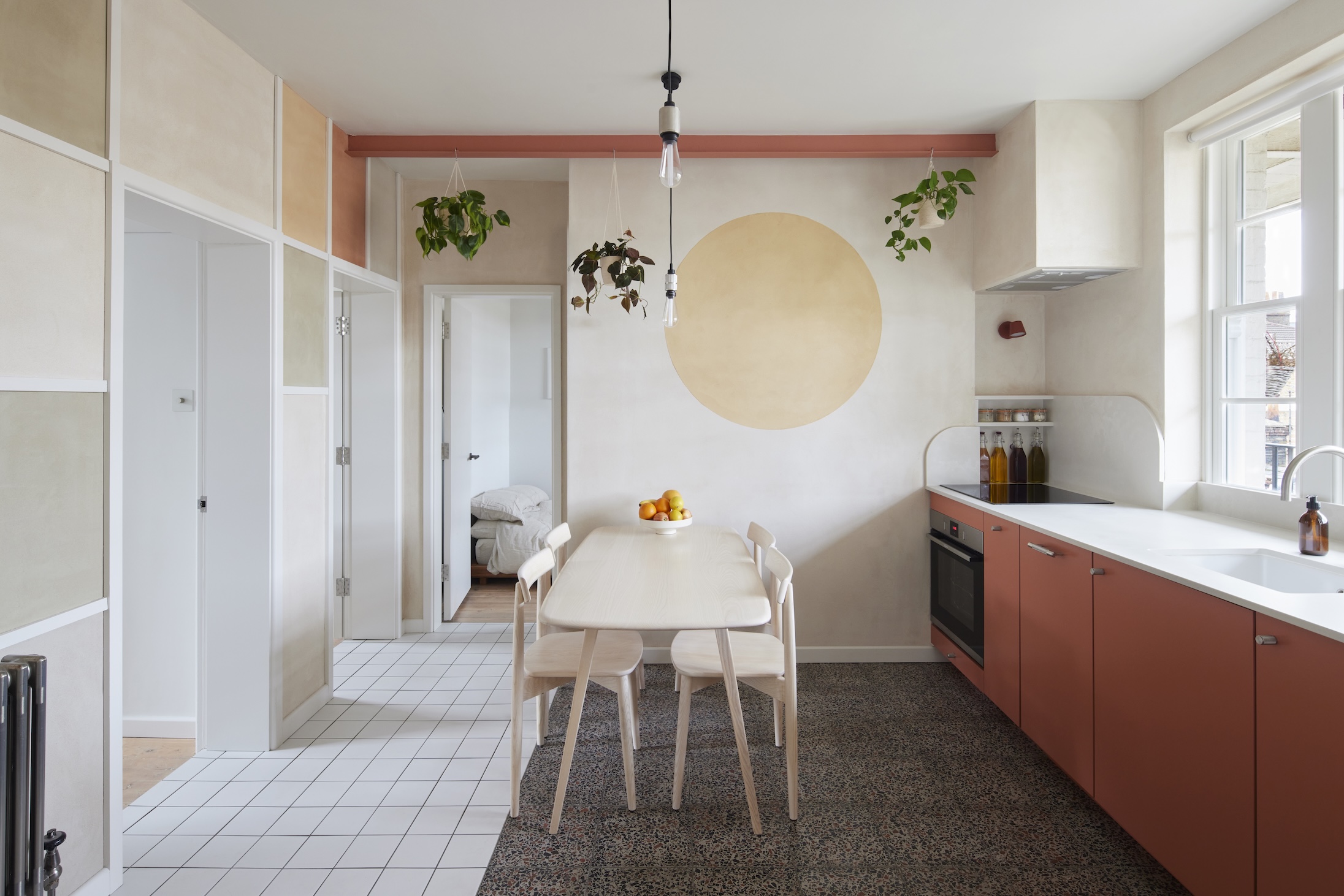 The sun is always shining in architect Josh Piddock’s apartment in London’s Hackney. That’s thanks to the kitchen mural, a simple but game-changing circle, that Josh planted in the heart of his carefully orchestrated flat.