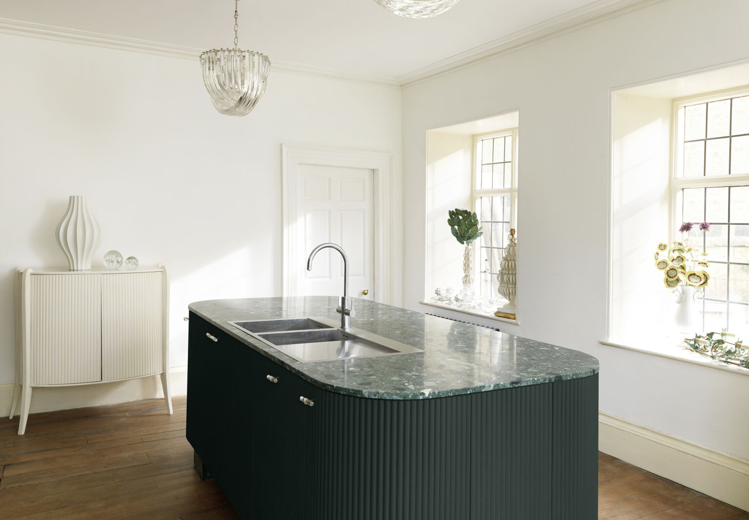 Lulu looked at 17th-century European painted furniture as a reference, and, after considering several Studio Maclean print options, went with the harlequin design in a rich green. “Our idea was to cover the main units in the print, but to break them up with a solid island and solid textural worktop and backsplash,” says Jason. “So, although it’s patterned, solid elements balance the whole effect.” Also, he might have added, their client is someone with an appetite for maximalist decoration.
