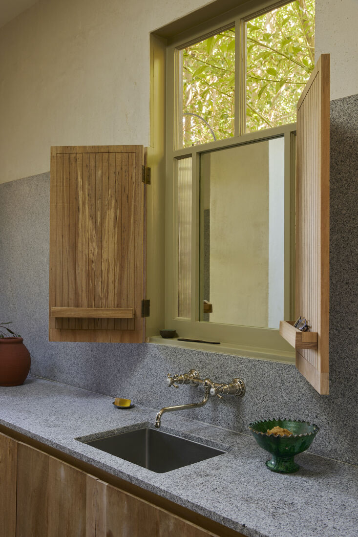 The restoration of his 1890 house has all the hallmarks of his prior project—quiet interiors, handsome window shutters, modest proportions, natural materials, a warm palette, all interpreted in an “Old California” style—but it has the added benefit of stunning views. Perched on a hill in Lincoln Heights, one of the oldest neighborhoods in East LA, the house was in ruins and scheduled to be torn down when Pat and his wife, Shannon, both native Californians, saw its potential and snapped up the property. They were intrigued by its architectural history (it was built in the vernacular style known as Pyramidal Victorian), enchanted by the surrounding lushness and views, and completely undaunted by the fact that it was, quite literally, a dump.