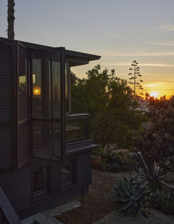“It had been owned by the same family for over 65 years. They had been renting it out to a variety of families over the years. Sadly, it was in a serious state of neglect: no insulation, no foundation, laminate floors, acrylic windows, along with buried garbage and abandoned vehicles throughout the garden,” says Pat. “Amidst all of that we were struck by the century-old olive tree, palm and pepper trees scattered throughout the property, along with some of the original Victorian detailing and large bay window overlooking downtown and the Hollywood sign.”