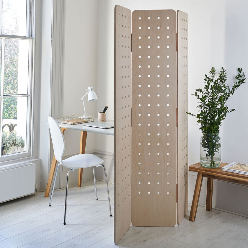 Lately Julie and I have been admiring folding screens and room dividers made from pegboard, for when you need movable dividers and extra storage. Use them for extra privacy in apartments and small spaces or to create extra zones in large ones.