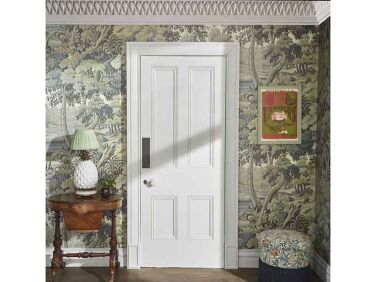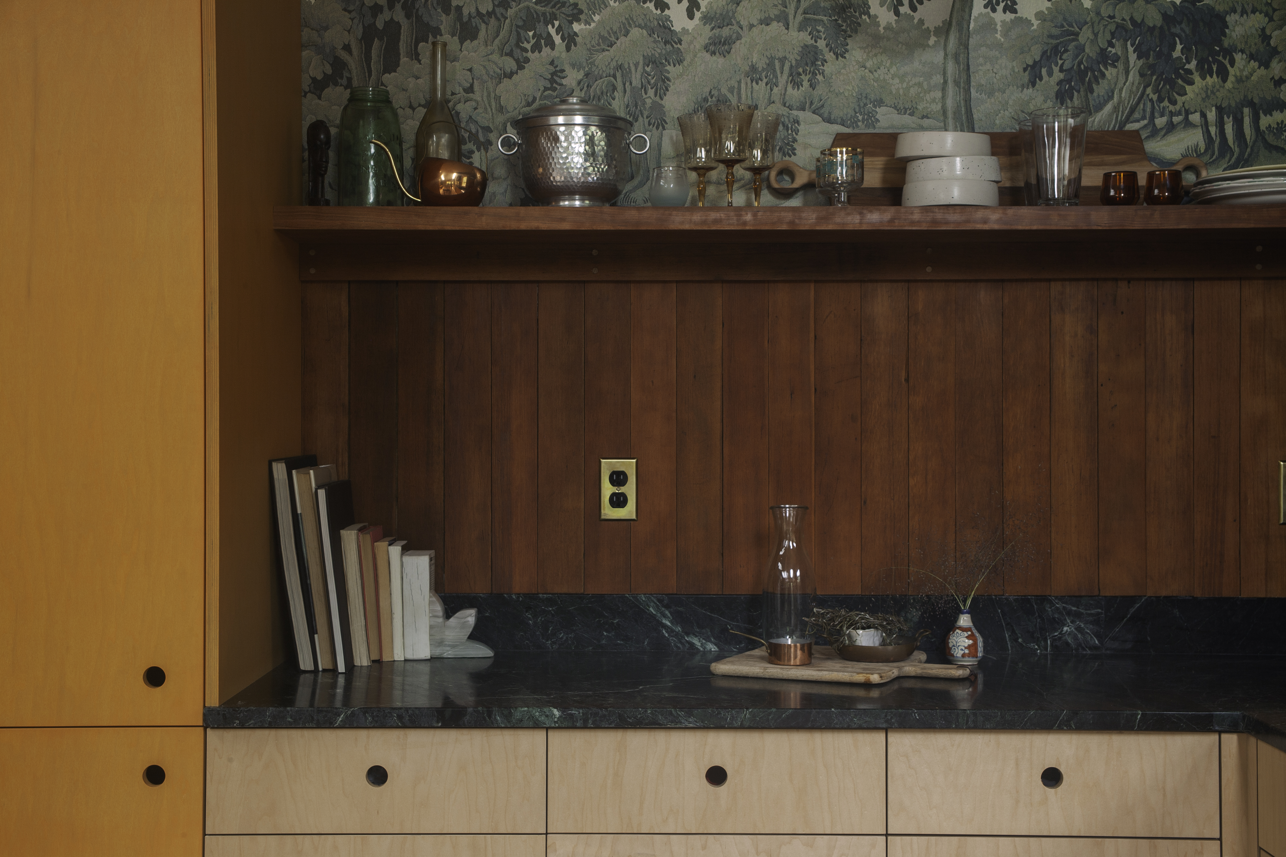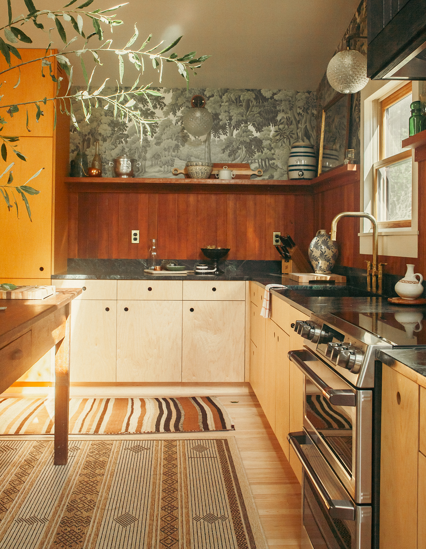 That encouragement sent Raisa and her husband, Andrew Putnam, on a three-year creative journey involving 19th-century-style landscape wallpaper, heart pine paneling, torched lumber, an old post office table, orange storage cabinets, maple floorboards that they pulled out of a condemned house themselves, and so much more. They splurged on elements, such as the locally made cabinets, and paid next to nothing for others (Raisa loves old things and is an avid Facebook Marketplace shopper).
