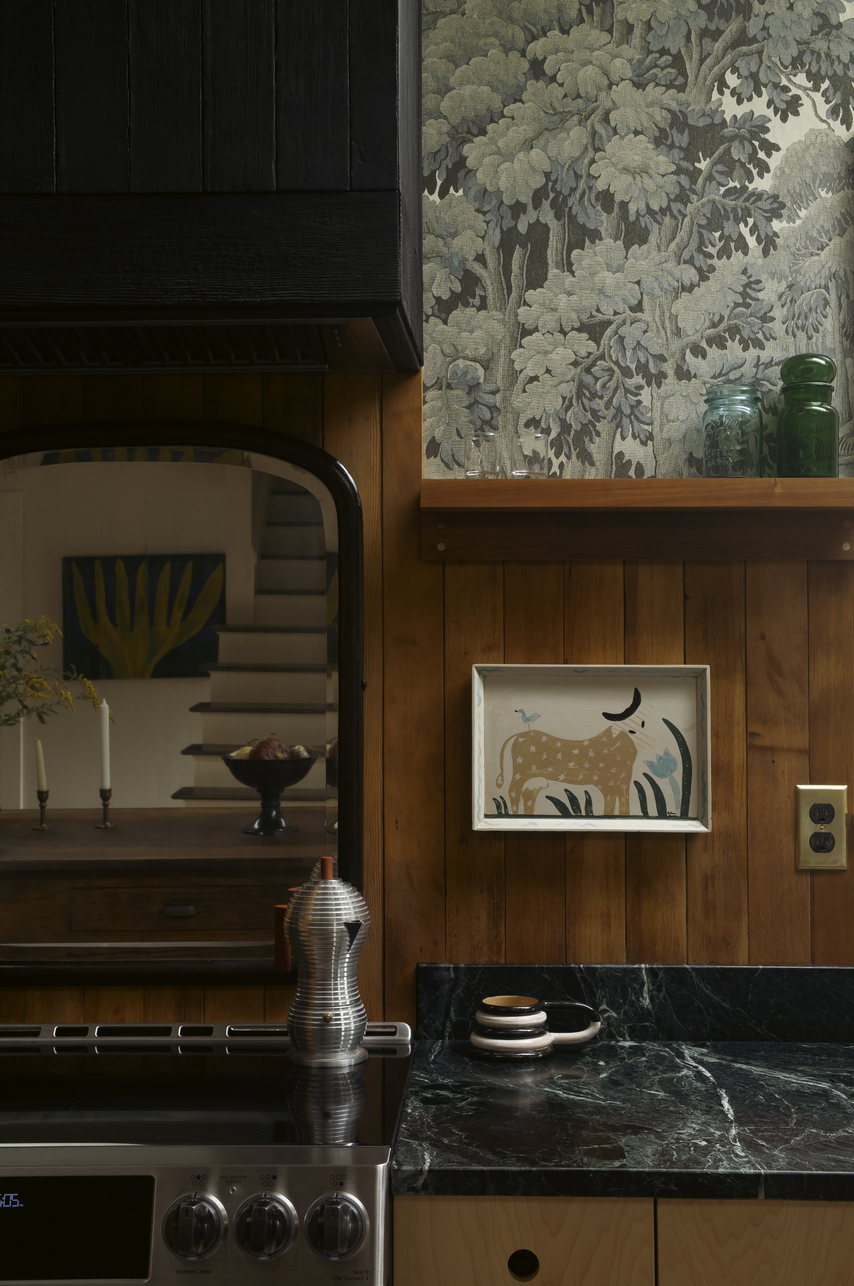 5. Two wild cards that work: a mirror as a stove backsplash and a shou sugi ban range hood cover.