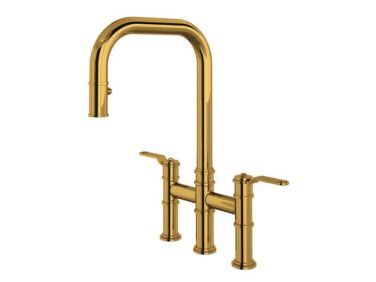 The cabinets ran to about $16,000, pantry wall included, and were the biggest cost. The brass faucet is Perrin & Rowe’s Armstrong Pull-Down Bridge Faucet, approximately $1,500, and Raisa notes, pairs well with the Vintage Globe Sconces from the Netherlands, $398, and Raw Brass Outlet and Light Switch Covers on the paneled walls.