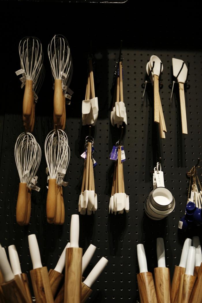 Above: The front of the store is devoted to a large Julia Child-style pegboard display of kitchen basics, including silicone-coated, Wood Handled Whisks (which can withstand higher temperatures than metal; $8 each) and Dipped Wood Rolling Pins ($19 each) made in Japan from acacia wood. West Elm Market offers a full range of pleasingly plain and simple White Enamelware, starting with measuring cups.
