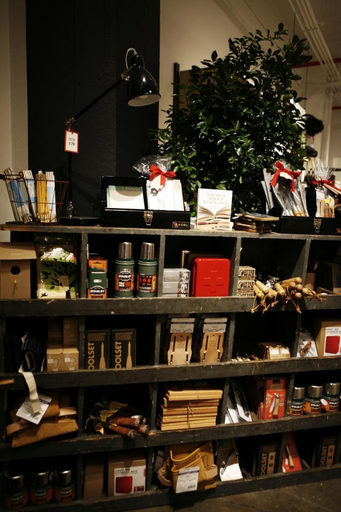 Above: The store’s tools section zeroes in on the best of the basics, from Stanley Thermoses to leather-handled hammers (and companion tool belts of moccasin leather).