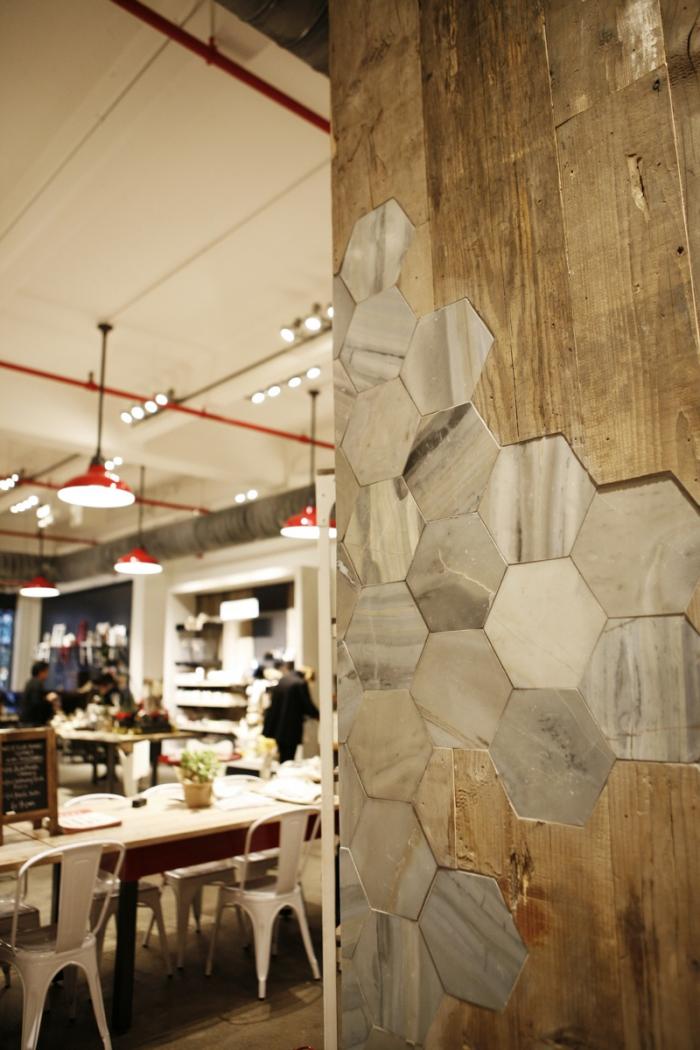 Above: The café’s structural supports are clad in a combination of reclaimed wood and hexagonal marble tile.