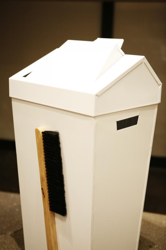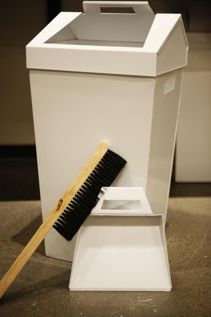 Above: It has a detachable top that doubles as a dust pan and a birch and coconut-bristle brush that attaches to the side of the can via strong magnets.