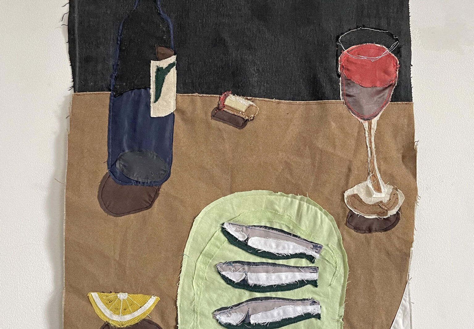 Come take a seat at Andrew Pierce Scott’s table. In his London studio, the American multi-media artist stitches feasts of seafood and wine and cigarettes. His textile banners salute centuries of art history, from medieval tapestries and 16th-century Dutch still lives to the semi-abstract way Matisse painted goldfish. They’re also autobiographical.