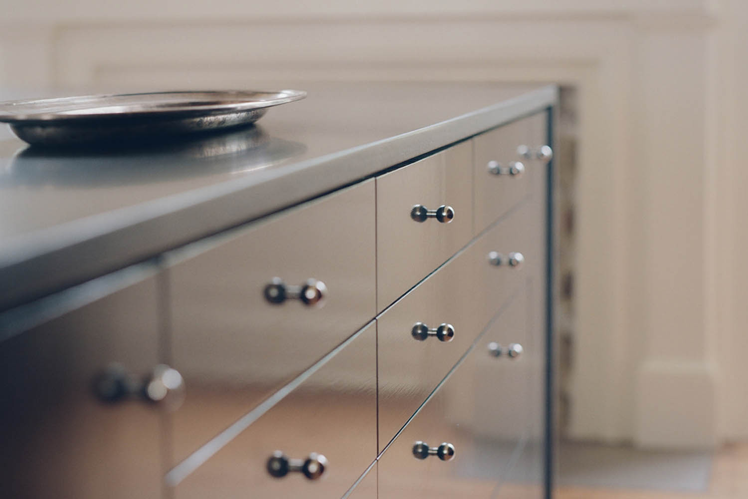 Noticed recently: tiny silver finish cabinet knobs used en masse in the kitchen or bath. Just as appealing on a single drawer, we like them both ways and the look has us considering a new hardware scheme in our own homes. Here are our favorites in polished or brushed stainless steel, nickel, or white bronze.