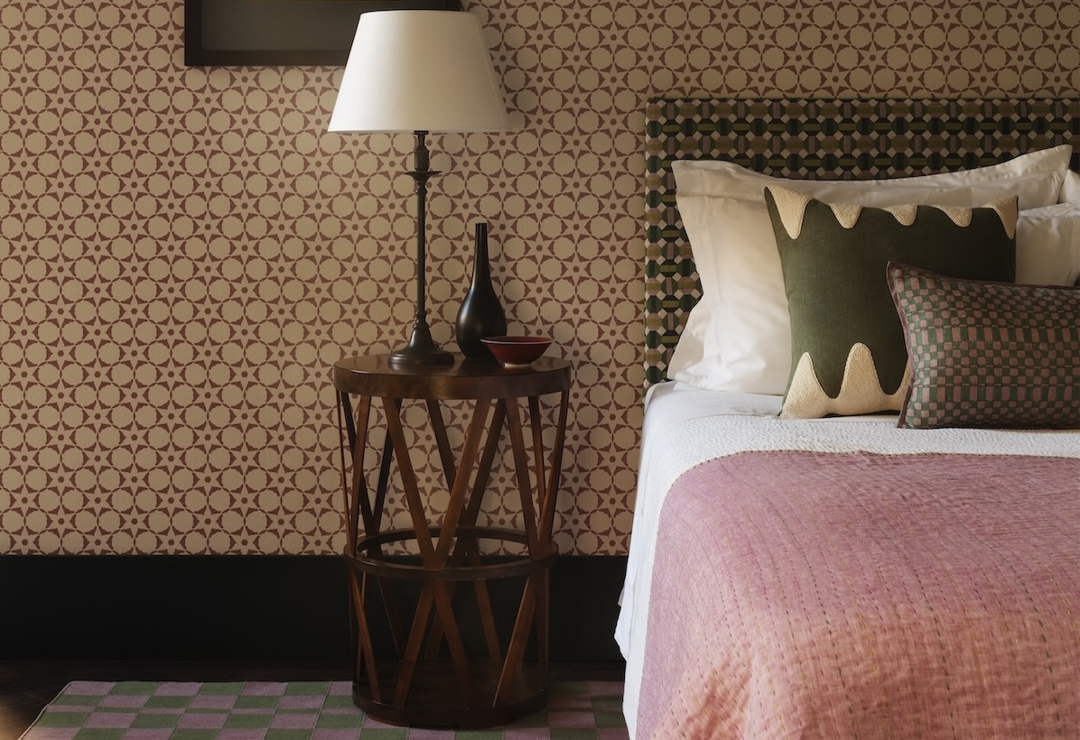 Opticality, Vanderhurd’s new block-printed linen designs, are available in the UK—the Vanderhurd shop is on Portobello Road—and at Studio Four NYC in Manhattan. Christine presents her latest collection in a series of pattern-on-pattern room settings that manage to feel composed, calm, and exciting.