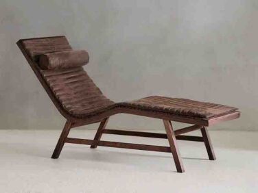 Above: The collection’s POV? “When one’s surroundings are unrestricted, so too is the spirit.” The linen Sofa 01 (left) is made in Spain of solid wood with down and a removable covering (from $6,600). Also shown are two of the angular, minimal Lounge Chair 02 (center/right), made in Portugal of thermo-treated ash wood ($1,400). “Pieces made from this wood may initially have a slight scent, characteristic of the noble wood,” according to the retailer. Above: The oak Table 01 is made in Spain and finished with a wax coating “that ensures the look and texture is as respectful as possible with the raw material….The wood changes over time becoming a unique piece” (from $4,300). Alongside: the Stool 02 ($799). Note the gently curved seat, :made from the same leather used for saddles.” Above: The Daybed 01 ($3,200). “Linen cushions can be removed, effortlessly transforming the solid oak frame into a coffee table or entry bench, while generous proportions and clean lines create an invitation to sit and share a conversation,” according to the retailer. Above: “Among Vincent Van Duysen’s favorite pieces, this area rug stands out, a reinterpretation of a design from his home in Antwerp. ” The kilim Rug 03 is woven in India (from $949). Above: The Desk 02 is made from “noble woods” and Campaspero stone ($4,300). Above: “This wooden chaise longue is reminscent of the chair Vincent Van Duysen used to have in his old Antwerp apartment,” according to the retailer. The oil-finished oak frame is suitable for use outdoors, too (minus the quilted topper). The Chaise Longue 01 is $4,000. Above: Another look at the desk and versatile stool (with a small storage shelf beneath the seat). Above: To browse the full collection—including smaller items like objects and textiles—head here.