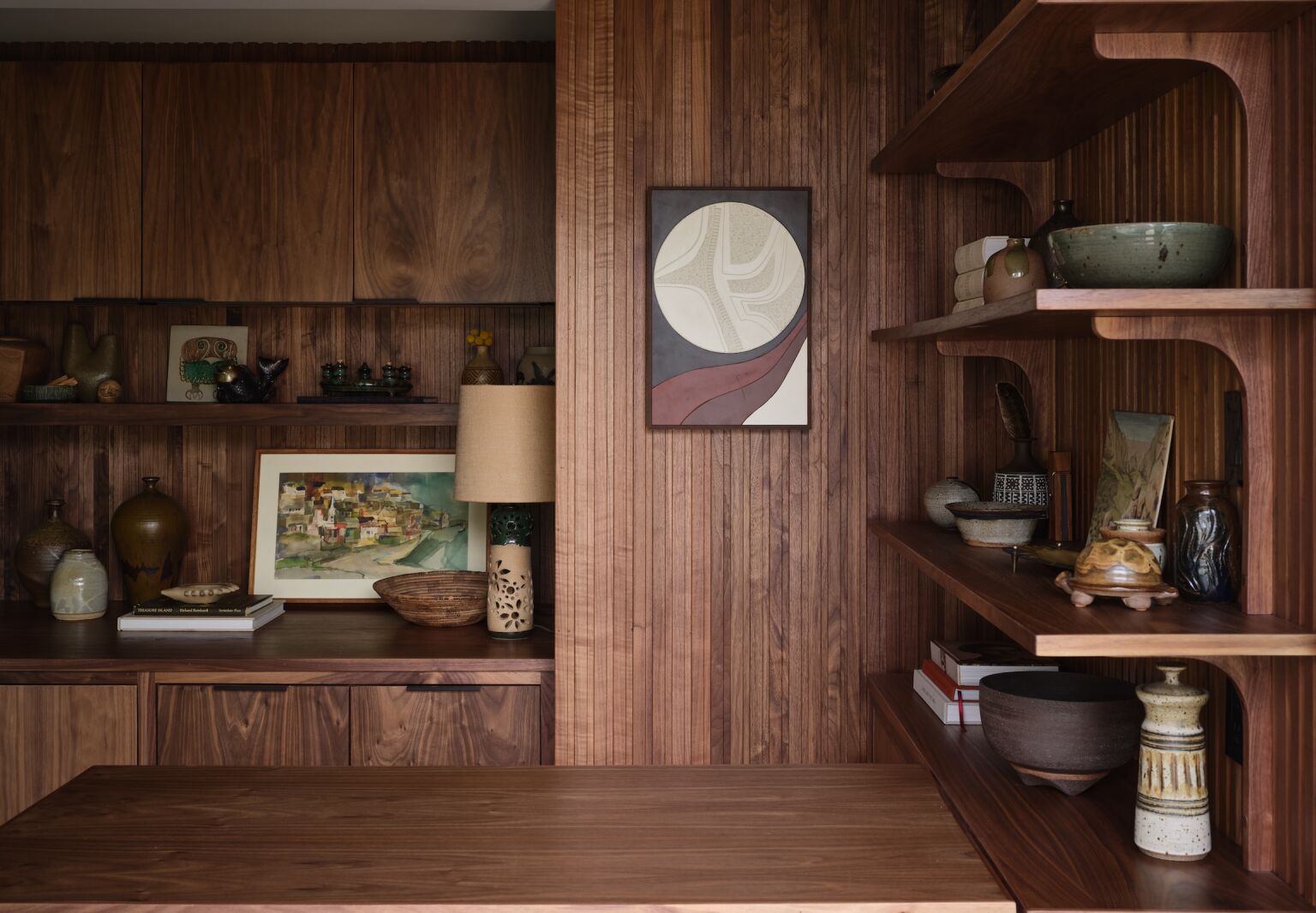 To cloak the two rooms in modernist slatted walnut paneling accented by glossy green tiles