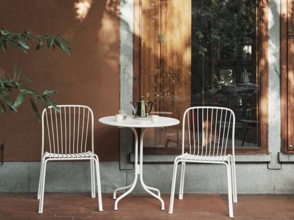 Tradition’s Thorvald SC94 is an outdoor dining chair featuring a steel frame and stackable design, with vertical lines of its backrest and grid-like seat lending it a sleek, airy profile. The Thorvald SC94 patio side chairs blend seamlessly with dining tables from the same collection and also pair beautifully with other styles of outdoor furniture, making them a versatile addition to any al fresco dining area. Designed by Space Copenhagen, the Thorvald collection offers a diverse suite of metal patio furniture, echoing the vibrant essence of Copenhagen and playing with sunlight to cast intriguing shadows on the ground. Inspired by the poetic lines of Denmark’s renowned neoclassical sculptor, Bertel Thorvaldsen, and the intricate motifs in his namesake museum, the Thorvald series is designed to animate any outdoor space, from chic urban terraces and snug balconies to spacious summer retreats, in both private and public settings.