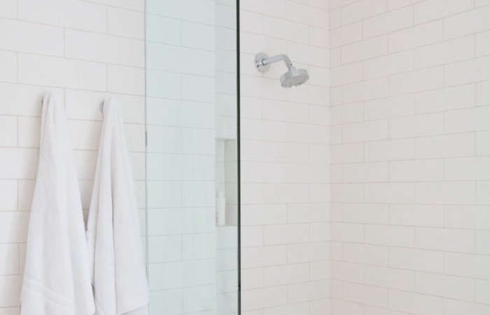 A Kohler Purist 2.0 gpm Single Function Showerhead in a bathroom by architect Barbara Bestor. Photograph by Jessica Comingore for Remodelista.
