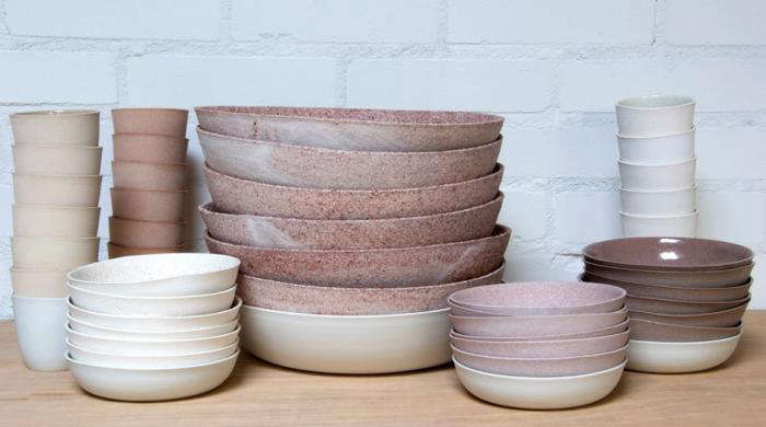 Her latest endeavor 6:1 also deals with the subject of waste and takes the residue used in the production of white porcelain to create a line of textured earthenware bowls and cups.