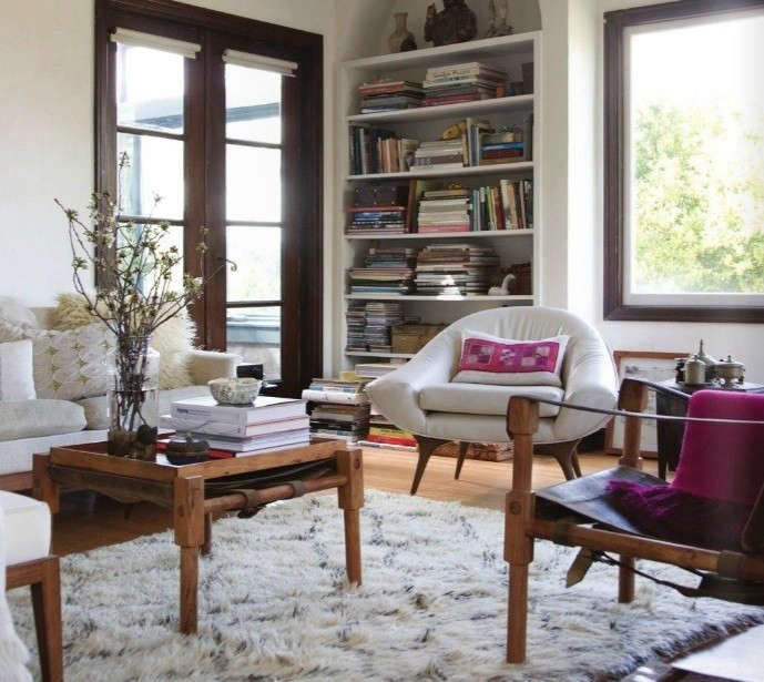 The living room in Erica’s home with a Beni Ouarain rug and hits of pink. I have a Beni Ourain Moroccan rug and I love to introduce ethnic items to a super-clean room, to add something rough hewn to the mix–it’s a great combination. Photograph by Kelly Ishikawa for Anthology Magazine.