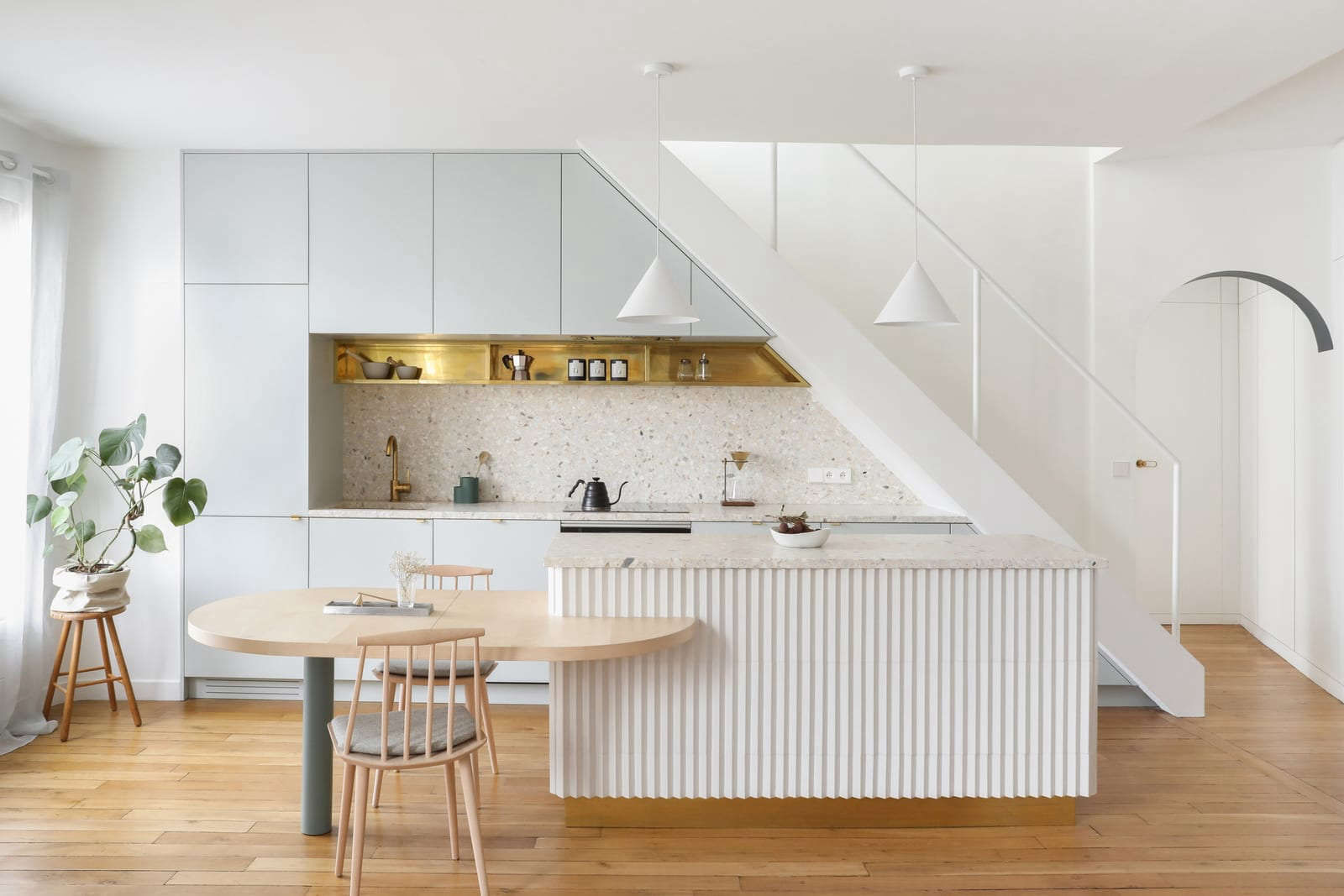 In an artist’s Paris apartment, Hélène Pinaud and Julien Schwartzmann of Heju Studio designed a kitchen island “dressed in relief tiles.” See more of the architects’ kitchen remodels here and here.