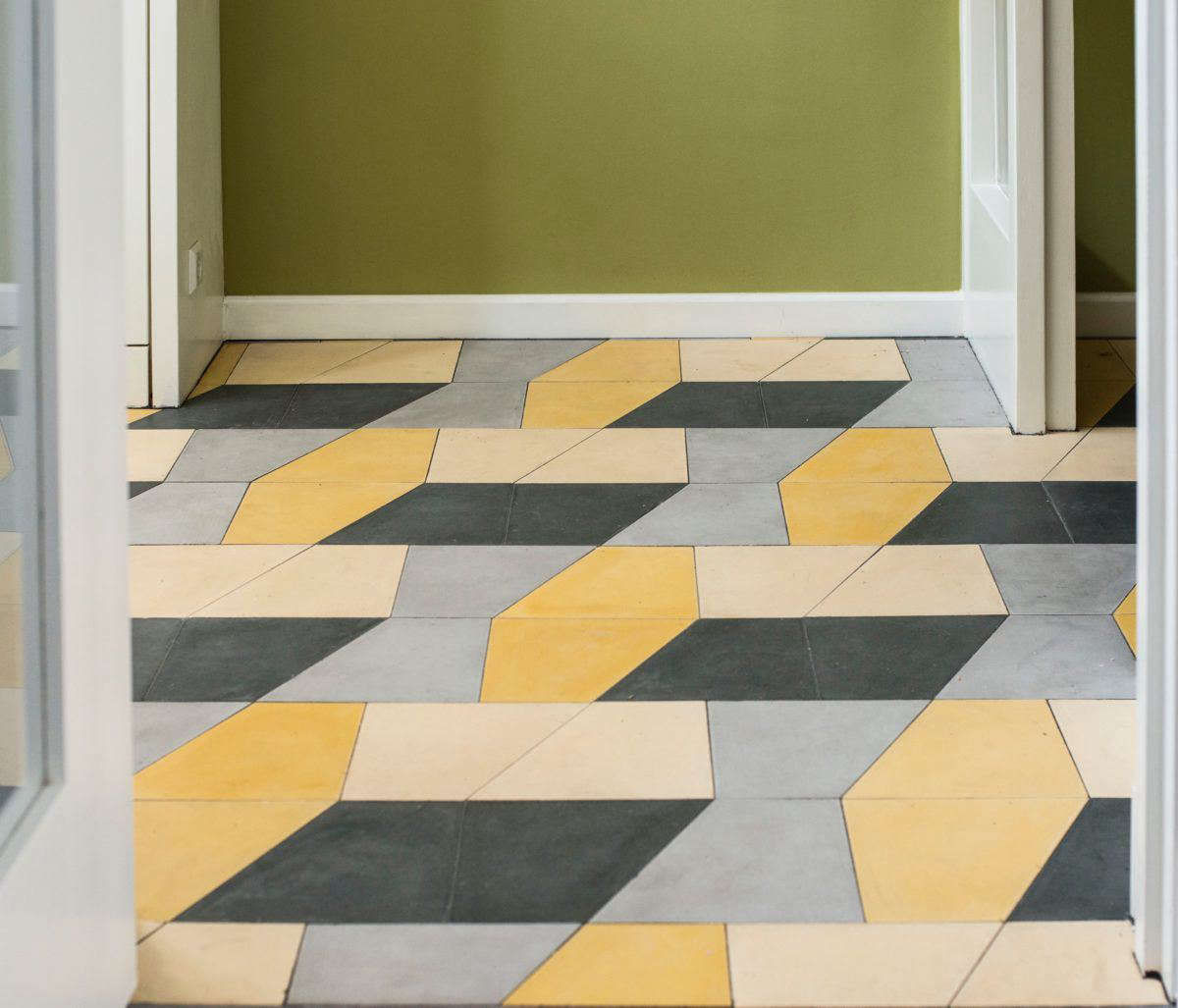 Even in bright colors, cement tile has a muted, chalky appearance. Here, an entryway composed of black, blue, yellow, and tan tiles from Huguet’s Plain Tile collection, in a combination created by Slovakian graphic designer Peter Biľak.