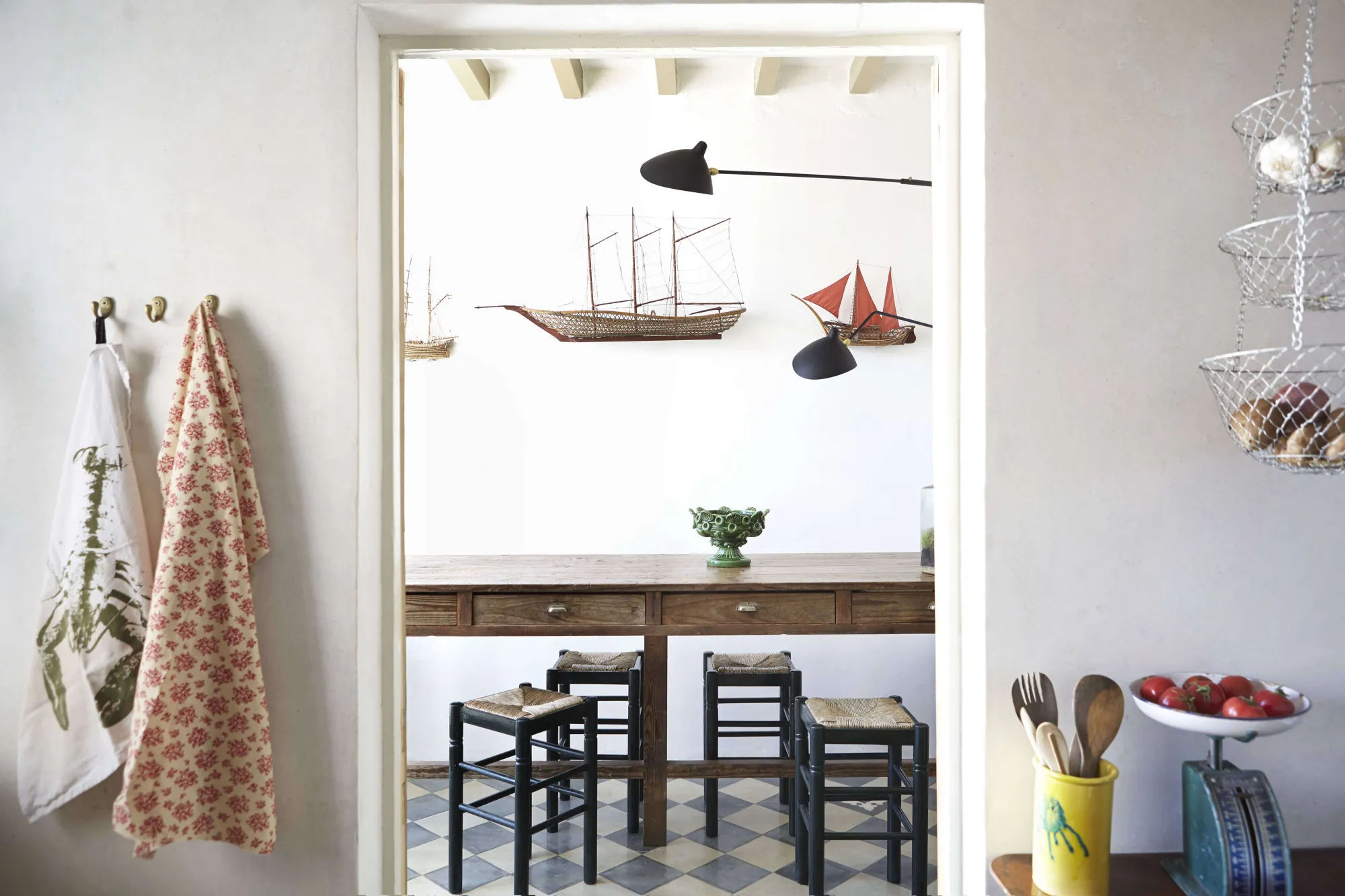 The marble-topped wooden counter and other furnishings are all vintage finds repurposed by the designers. The pot rack is a traditional Menorcan clothes rail.