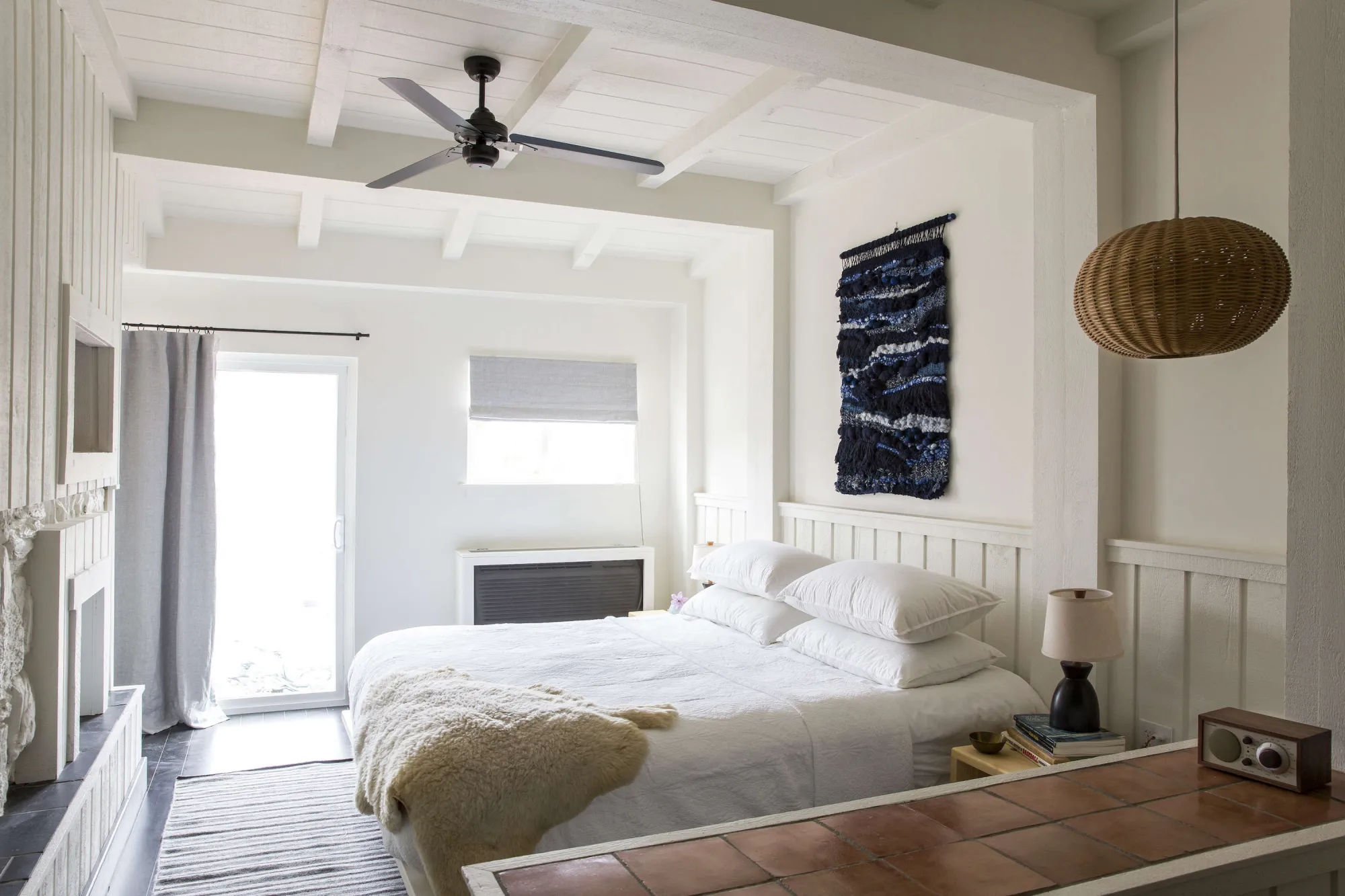 One of the smaller bedrooms also features a macramé hanging from The Catskill Kiwi.